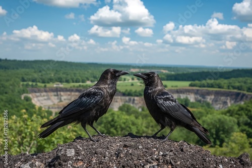 © AImmersive Imagery, Naklejka premium Two crows conversing above a reclaimed mining area in the countryside.