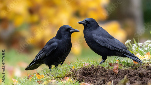 © Sarfan, Fototapeta premium Two crows perched on grass against a blurred autumn background, side by side