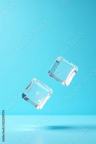 Fototapeta premium Two Crystal Clear Ice Cubes Falling Against a Light Blue Background, a...