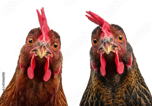 © Barny, Naklejka premium Two curious domestic chickens, brown and speckled hens with vivid red combs, tilt heads, wide eyes, direct gaze on plain white studio background with soft lighting. Curious animal portrait