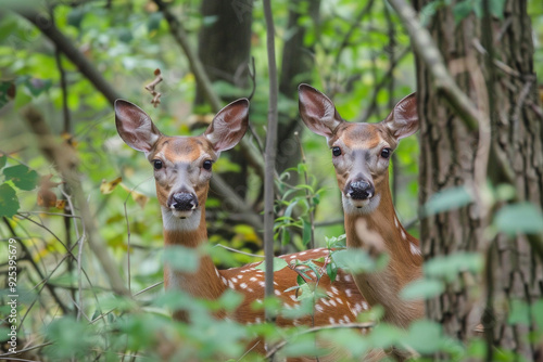 Fototapeta premium Two Curious Fawns Hidden in the Woods