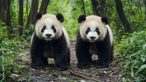 © SANDJAYA, Obraz premium Two Curious Pandas on a Forest Path