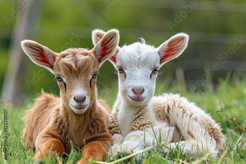 © aminsmart, Obraz premium Two cute baby goats sheep sitting on a green meadow background
