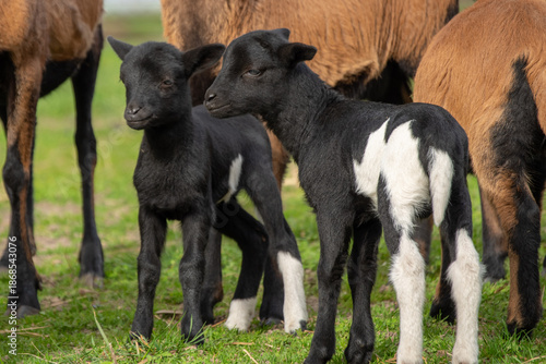 © Bogdan, Fototapeta premium Two Cute Black Lambs Standing Together in a Field
