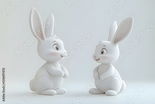 Obraz premium Two Cute Cartoon Bunnies Smiling and Engaging with Each Other on Soft White Background