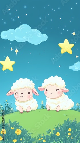Obraz premium Two cute cartoon sheep sitting on a grassy hill under a starry sky with clouds.