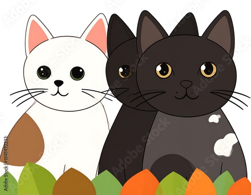 © ari, Obraz premium Two cute cats, one white with spots, one black, in autumn leaves