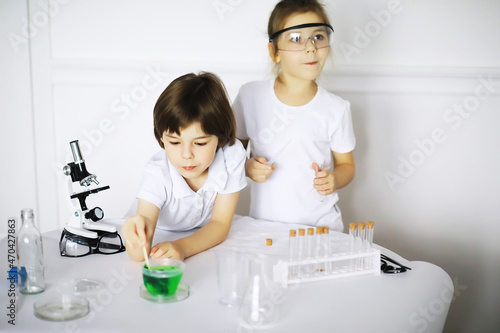 Fototapeta premium Two cute children at chemistry lesson making experiments on white background
