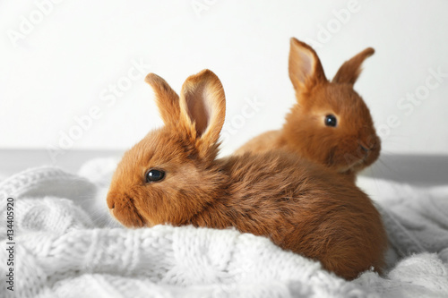 Fototapeta premium Two cute fluffy bunnies on white blanket