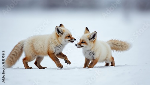 © Aimag, Obraz premium Two cute fox cubs playing in the snow