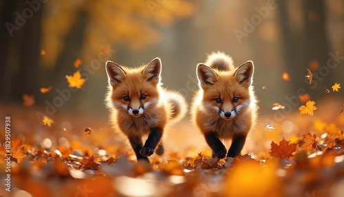 © Vadym, Naklejka premium Two cute fox kits run through vibrant autumn leaves. Sunlight illuminates their fur as they play in a forest clearing during leaf fall. Their joyful movement captures the of fall.