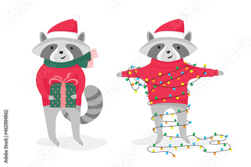 Obraz premium Two cute holiday raccoons with gift and garland. Happy New Year and Merry Christmas. Vector flat cartoon illustration.