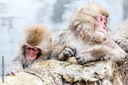 Naklejka premium Two cute Japanese macaque sitting in a hot spring. Snow monkeys (Macaca fuscata) from Yudanaka, Japan, Nagano Prefecture.