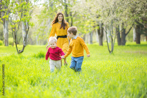 © Anna, Obraz premium Two cute little boys playing with mother outdoor in park.