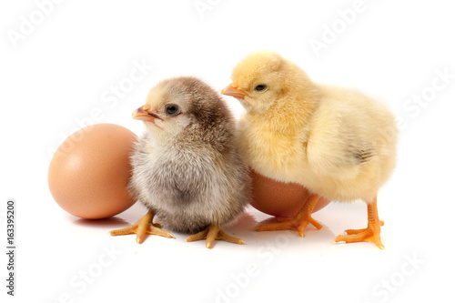 © kolesnikovserg, Fototapeta premium two cute little chicken with egg isolated on white background