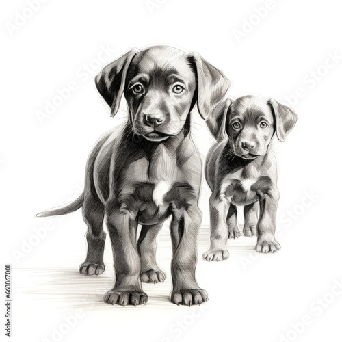 Fototapeta premium Two Cute Puppies in Black and White Graphic Isolated on White Background