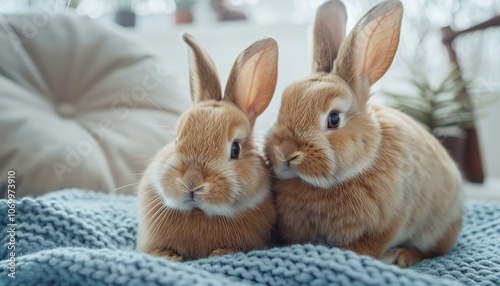 © Saad, Obraz premium Two cute rabbits are sitting on blue knitted plaid