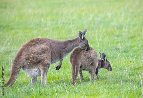 © Elena Pochesneva, Fototapeta premium Two cute wallaby kangaroo is grazing on a green meadow in Australia, wildlife and beauty in nature