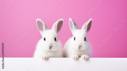 © Rassamee, Fototapeta premium Two cute white rabbits, fluffy fur, pink background.