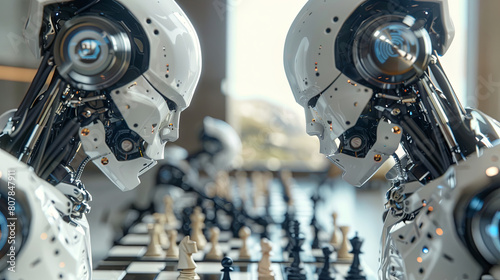 © Kateryna Kordubailo, Fototapeta premium two cyborg robots playing chess in white room