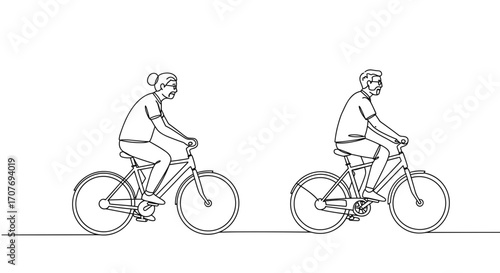 Fototapeta premium Two cyclists riding bicycles in line art style on a transparent background