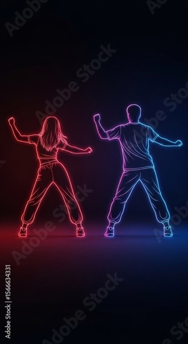 Fototapeta premium Two dancers are performing with red and blue neon lights, creating a vibrant and energetic atmosphere, suggesting themes of nightlife, entertainment, and artistic expression
