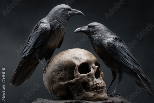 © Herlita, Fototapeta premium Two dark birds perch atop a weathered human skull in dramatic lighting