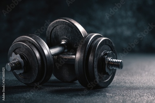 © lumpia, Naklejka premium Two dark dumbbells on a dark surface