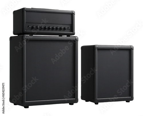 Obraz premium Two dark grey guitar amplifier stacks, one with two cabinets and a head unit,...