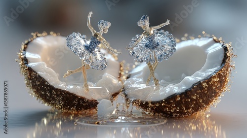 © Diffin, Fototapeta premium Two delicate glass ballerinas in sparkling tutus dance on a halved coconut, blending elegance with tropical charm.