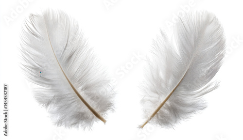 © Suppawith, Obraz premium Two Delicate Grey Feathers on White Background Close Up