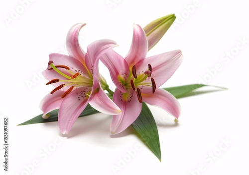 © Jakiya Graphics, Fototapeta premium Two Delicate Pink Lilies with Green Leaves Isolated on White Background