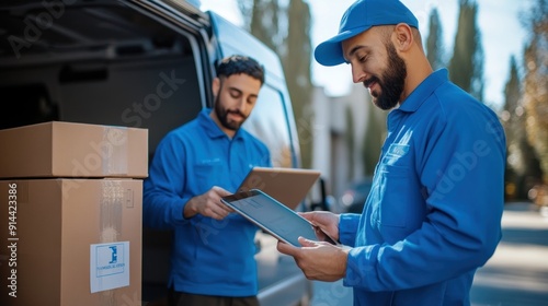 © inthasone, Obraz premium Two delivery men in blue uniforms use a tablet computer while loading packages with their coworker in a delivery van.