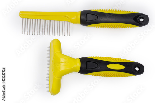 © An-T, Obraz premium Two different plastic combs for pets with round metal teeth