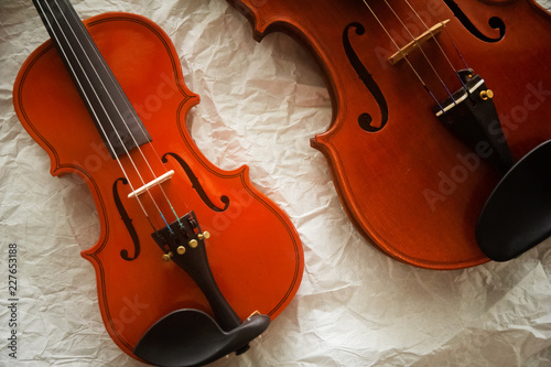 Fototapeta premium Two different size of violins put on background,shw detail of front side.