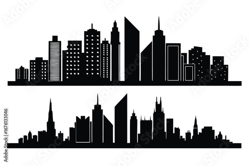 Fototapeta premium Two distinct black and white city skyline silhouettes with varied architectural styles on white background