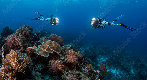 Fototapeta premium Two Divers Exploring Colorful Coral Reef Underwater Ecosystem