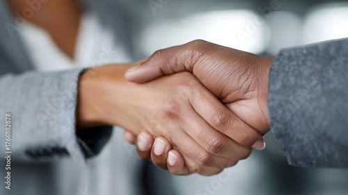© Thares2020, Obraz premium Two diverse professionals shaking hands symbolizing agreement partnership and successful business collabo n