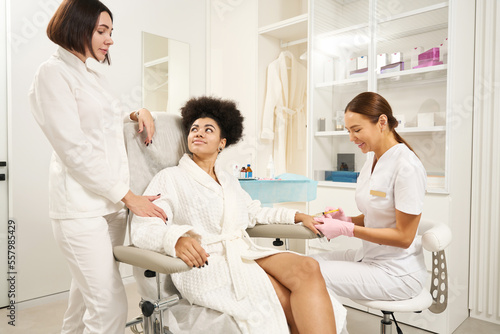 Fototapeta premium Two doctors consulting client in beauty salon during procedure