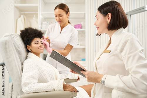 Fototapeta premium Two doctors consulting woman in beauty salon
