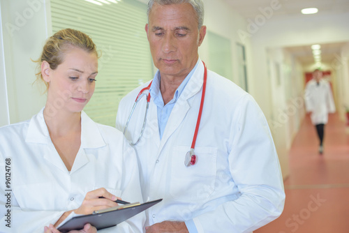 © auremar, Fototapeta premium Two doctors looking at clipboard in hospital corridor