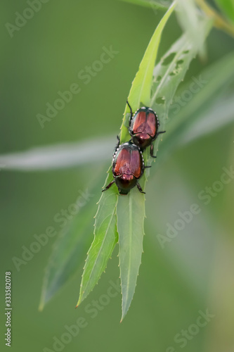 Naklejka premium Two Dogbane beetles resting on a leaf