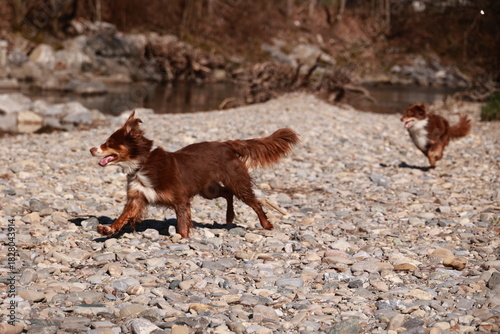 © flucas, Obraz premium Two dogs are running on a rocky beach