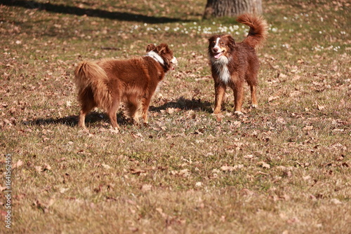 Naklejka premium Two dogs are standing in a field of brown grass and leaves