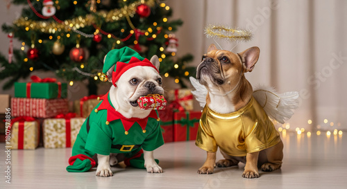 © PhotoArtHub, Fototapeta premium Two dogs, one in green elf costume holding a gift, the other in gold with halo and wings, near Christmas tree with gift boxes, festive concept