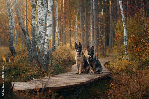 Naklejka premium two dogs sit together on a wooden path in the forest. Beautiful German and...