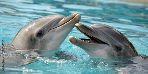 © Roman, Naklejka premium Two dolphins are swimming together, displaying social behavior and interacting playfully. They are in a clear blue pool, enjoying the warm afternoon sun