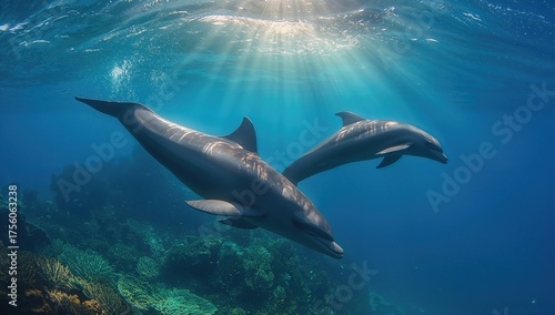 Fototapeta premium Two dolphins frolicking beneath shimmering sunlight in the ocean