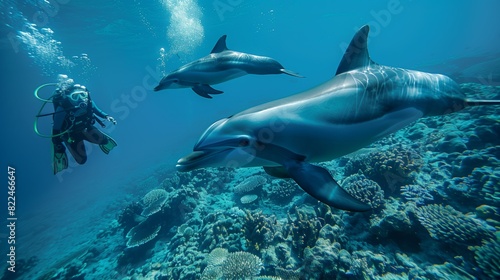Fototapeta premium Two dolphins gracefully swim above a vibrant coral reef