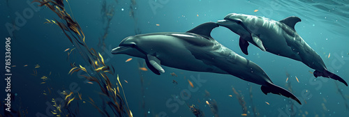 Fototapeta premium Two dolphins gracefully swim through the clear blue ocean water